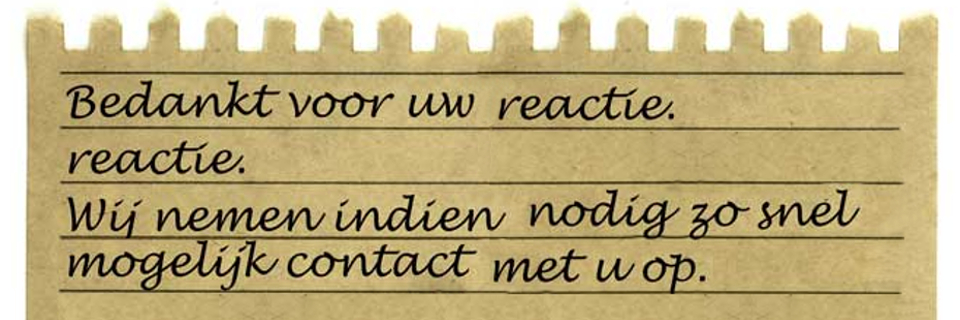 Uw gegevens zijn in goede orde ontvangen. Wij zullen zo spoedig mogelijk contact met u opnemen. Mocht u tussentijds nog vragen hebben, u kunt tijdens kantooruren telefonisch contact opnemen via 0162 742 010.